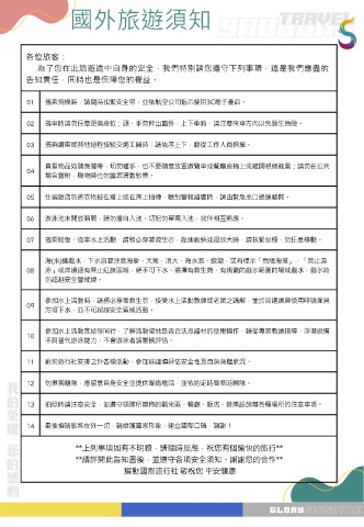 13 拍照時請注意安全,並遵守領隊所宣佈的觀光區、餐廳、飯店、遊樂設施等各種場所的注意事項。