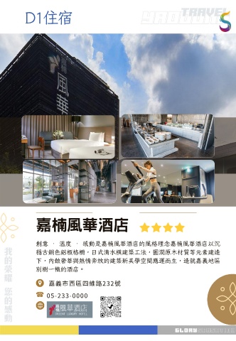 D1住宿 嘉楠風華酒店 創意 ‧ 溫度 ‧ 感動是嘉楠風華酒店的風格理念嘉楠風華酒店以沉 穩古銅色鋁板格柵,日式清水模建築工法,圓潤原木材質等元素建造 下,內斂奢華與熱情奔放的建築新美學空間應運而生,造就嘉義地區 別樹一幟的酒店。 嘉義市西區四維路232號 05-233-0000