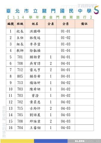 編號 班級 姓名 分桌 分房 備註