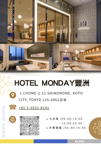 HOTEL MONDAY豐洲 1 CHOME-2-11 SHINONOME, KOTO CITY, TOKYO 135-0062日本 +81 3-3532-8141 大浴場 /05: 00- 10: 00 、15: 00- 25: 00 早餐餐廳 / 06: 30- 10: 00