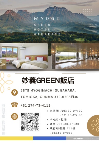 妙義GREEN飯店 2678 MYOGIMACHI SUGAHARA, TOMIOKA, GUNMA 379-0208日本 +81 274-73-4111 大浴場 /05: 00- 09: 00 、12: 00- 23: 30 卡啦OK包廂 賣店 / 08: 30- 19: 30 飛行船餐廳 /11樓 / 06: 30- 09: 00