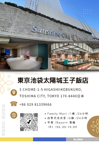 東京池袋太陽城王子飯店 3 CHOME-1-5 HIGASHIIKEBUKURO, TOSHIMA CITY, TOKYO 170-8440日本 +86 029 81339666 Family Mart / 1樓 / 24小時 投幣式洗衣室 / 6樓 / 24小時 早餐 / Bayern 餐廳 / B1 / 06: 30- 10: 00