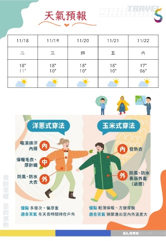 天氣預報 11/18 11/19 11/20 11/21 11/22 二 三 四 五 六 18° 18° 18° 18° 17° 11° 10° 10° 10° 06°