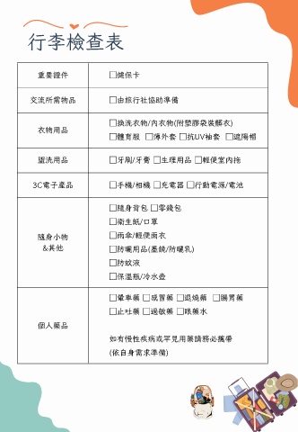 盥洗用品 □牙刷/牙膏 □生理用品 □輕便室內拖