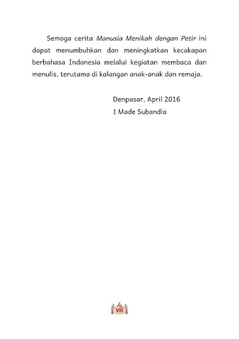 Semoga cerita Manusia Menikah dengan Petir ini dapat menumbuhkan dan meningkatkan kecakapan berbahasa Indonesia melalui kegiatan membaca dan menulis, terutama di kalangan anak-anak dan remaja. Denpasar, April 2016 I Made Subandia vii