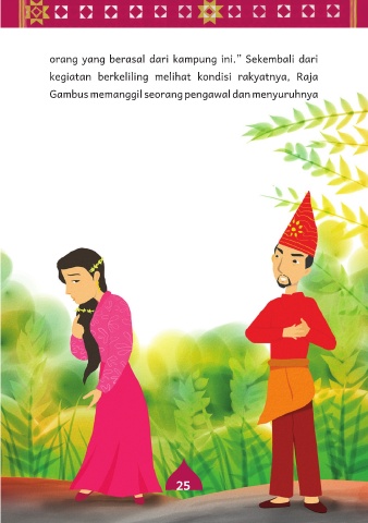orang yang berasal dari kampung ini.” Sekembali dari kegiatan berkeliling melihat kondisi rakyatnya, Raja Gambus memanggil seorang pengawal dan menyuruhnya 25
