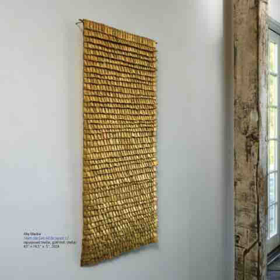 130 Aby Mackie 14am We Can All Be Saved 17 repurposed textile, gold leaf, shellac 43” x 19.5” x .5”, 2024
