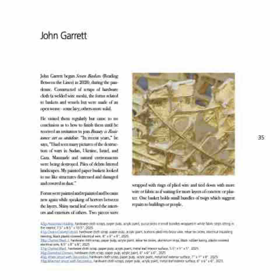 39jg Bleached Vessel with Decoration, hardware cloth scraps, paper pulp, acrylic paint, metal leaf exterior surface, 6” x 6” x 6”, 2025