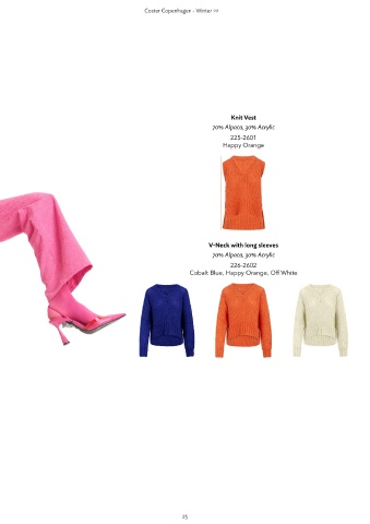 Coster Copenhagen - Winter 22 Coster Copenhagen - Winter 22 Knit Vest 70% Alpaca, 30% Acrylic 225-2601 Happy Orange V-Neck with long sleeves 70% Alpaca, 30% Acrylic 226-2602 Cobalt Blue, Happy Orange, Off White 24 25