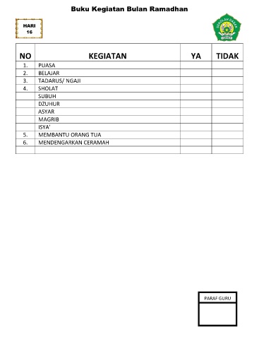Buku Kegiatan Bulan Ramadhan HARI 16 NO KEGIATAN YA TIDAK 1. PUASA 2. BELAJAR 3. TADARUS/ NGAJI 4. SHOLAT SUBUH DZUHUR ASYAR MAGRIB ISYA’ 5. MEMBANTU ORANG TUA 6. MENDENGARKAN CERAMAH PARAF GURU