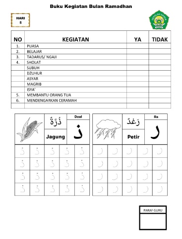 Buku Kegiatan Bulan Ramadhan HARI 5 NO KEGIATAN YA TIDAK 1. PUASA 2. BELAJAR 3. TADARUS/ NGAJI 4. SHOLAT SUBUH DZUHUR ASYAR MAGRIB ISYA’ 5. MEMBANTU ORANG TUA 6. MENDENGARKAN CERAMAH PARAF GURU