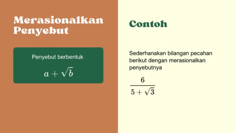 Merasionalkan Contoh Penyebut Sederhanakan bilangan pecahan Penyebut berbentuk berikut dengan merasionalkan penyebutnya