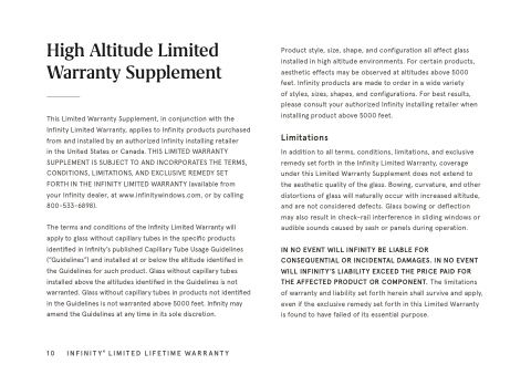In addition to all terms, conditions, limitations, and exclusive remedy set forth in the Infinity Limited Warranty, coverage under this Limited Warranty Supplement does not extend to the aesthetic quality of the glass. Bowing, curvature, and other distortions of glass will naturally occur with increased altitude, and are not considered defects. Glass bowing or deflection may also result in check-rail interference in sliding windows or audible sounds caused by sash or panels during operation.