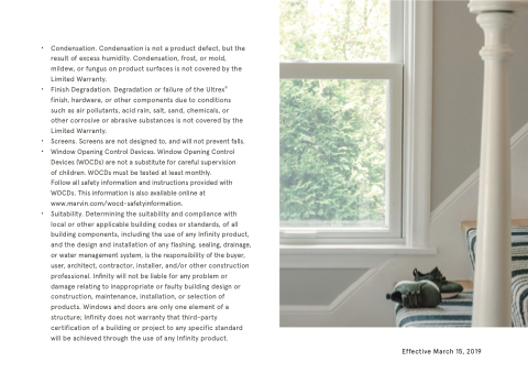 • Suitability. Determining the suitability and compliance with local or other applicable building codes or standards, of all building components, including the use of any Infinity product, and the design and installation of any flashing, sealing, drainage, or water management system, is the responsibility of the buyer, user, architect, contractor, installer, and/or other construction professional. Infinity will not be liable for any problem or damage relating to inappropriate or faulty building design or construction, maintenance, installation, or selection of products. Windows and doors are only one element of a structure; Infinity does not warranty that third-party certification of a building or project to any specific standard will be achieved through the use of any Infinity product.