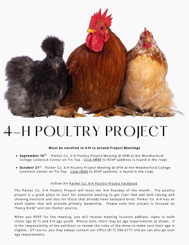 The Parker Co. 4-H Poultry Project will meet the 3rd Tuesday of the month. The poultry
