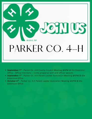 September 1 - Parker Co. 4-H County Council Meeting @6PM @ the Extension