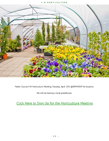 4 - H H O R T I C U L T U R E Parker Co. 4-H Horticulture Parker County 4-H Horticulture Meeting, Tuesday, April 13th @6PM RSVP for location. We will be touring a local greenhouse. Click Here to Sign Up for the Horticulture Meeting - 2 2 -