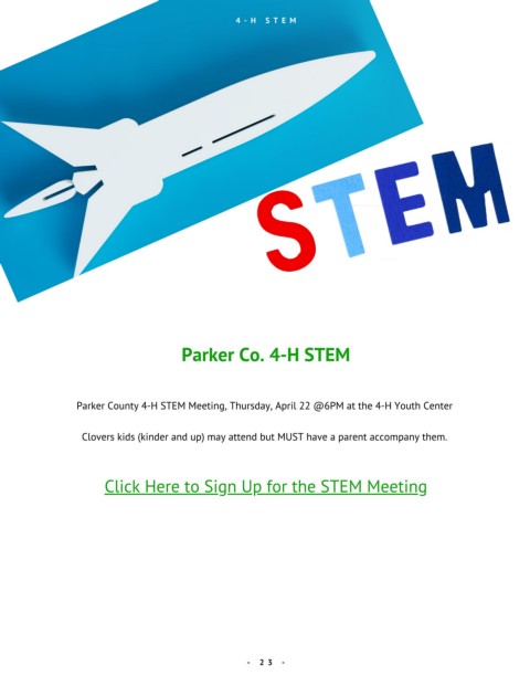 4 - H S T E M Parker Co. 4-H STEM Parker County 4-H STEM Meeting, Thursday, April 22 @6PM at the 4-H Youth Center Clovers kids (kinder and up) may attend but MUST have a parent accompany them. Click Here to Sign Up for the STEM Meeting - 2 3 -