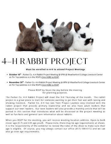 The Parker Co. 4-H Rabbit Project will meet the 3rd Thursday of the month. The rabbit