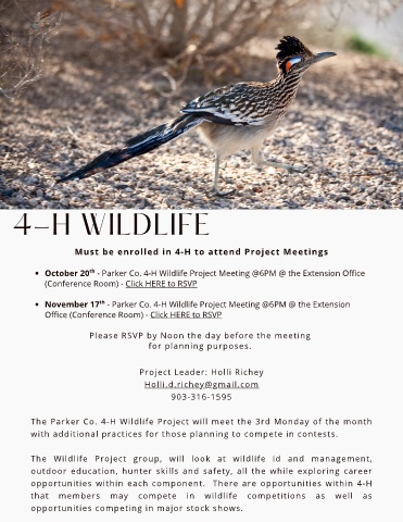 October 20 - Parker Co. 4-H Wildlife Project Meeting @6PM @ the Extension Office