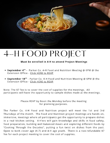 September 18 - Parker Co. 4-H Food and Nutrition Meeting @ 6PM @ the