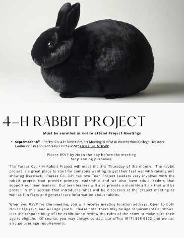 September 18   - Parker Co. 4-H Rabbit Project Meeting @ 6PM @ Weatherford College Livestock