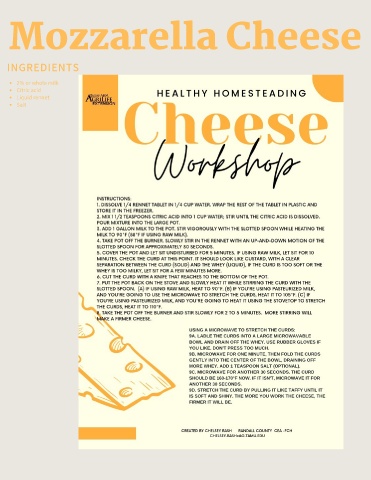 Mozzarella Cheese INGREDIENTS 2% or whole milk Citric acid Liquid rennet Salt