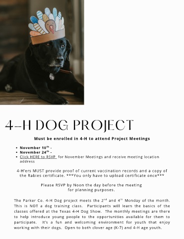 The Parker Co. 4-H Dog project meets the 2 nd and 4 Monday of the month.