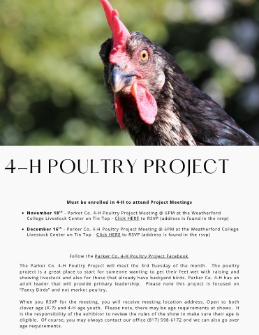 The Parker Co. 4-H Poultry Project will meet the 3rd Tuesday of the month. The poultry