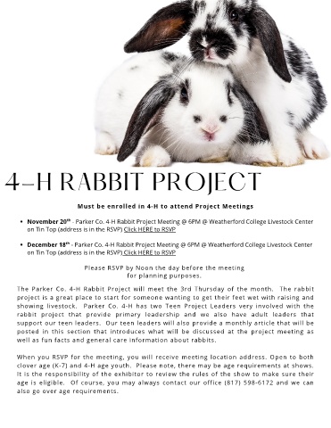 The Parker Co. 4-H Rabbit Project will meet the 3rd Thursday of the month. The rabbit