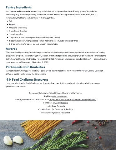 Each Senior and Intermediate teams may include in their equipment box the following “pantry” ingredients