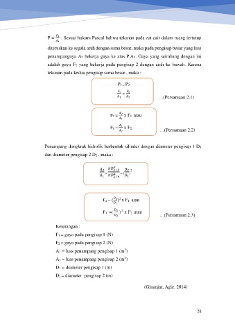 P = . Sesuai hukum Pascal bahwa tekanan pada zat cair dalam ruang tertutup