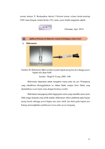 lebih tinggi daripada yang lebih rendah. Hidrometer diberi pemberat pada bagian