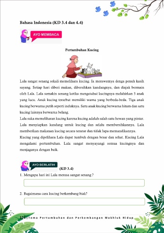 Lala sangat senang sekali memelihara kucing. Ia merawatnya denga penuh kasih