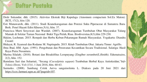 Francisca Murti Setyowati dan Wardah. (2007). Keanekaragaman Tumbuhan Obat Masyarakat Talang