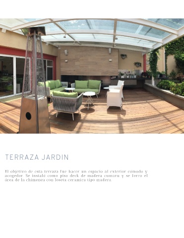 TERRAZA JARDIN El objetivo de esta terraza fue hacer un espacio al exterior cómodo y acogedor. Se instaló como piso deck de madera cumaru y se forro el área de la chimenea con loseta ceramica tipo madera.