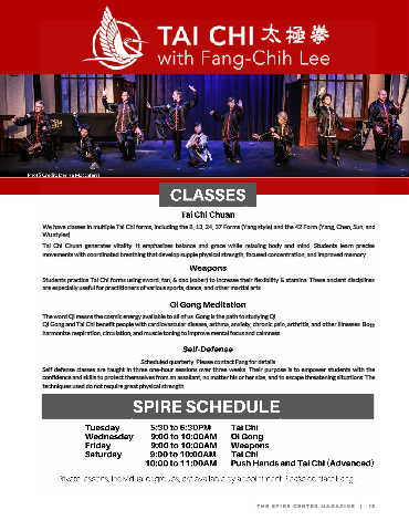 Tai Chi Chuan generates vitality. It emphasizes balance and grace while relaxing body and mind. Students learn precise