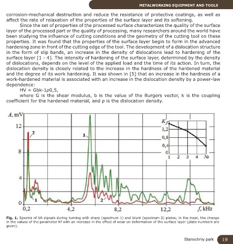 Fig. 1. Spectra of VA signals during turning with sharp (spectrum 1) and blunt (spectrum 2) plates; in the inset, the change