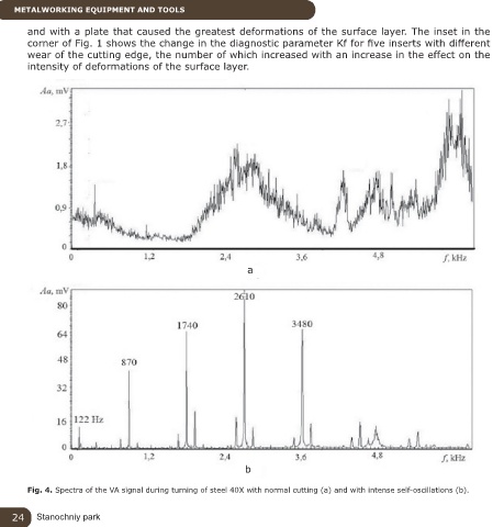 Fig. 4. Spectra of the VA signal during turning of steel 40X with normal cutting (a) and with intense self-oscillations (b).