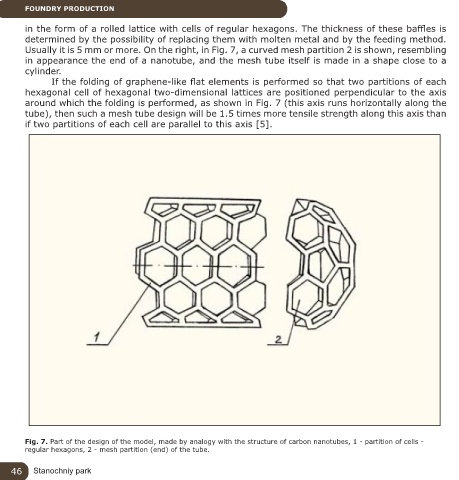 Fig. 7. Part of the design of the model, made by analogy with the structure of carbon nanotubes, 1 - partition of cells -