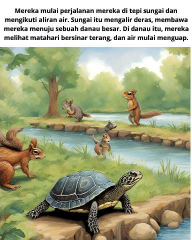 Mereka mulai perjalanan mereka di tepi sungai dan mengikuti aliran air. Sungai itu mengalir deras, membawa mereka menuju sebuah danau besar. Di danau itu, mereka melihat matahari bersinar terang, dan air mulai menguap.