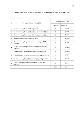 HASIL PENGAMATAN AKTIVITAS BELAJAR PESERTA WORKSHOP PADA SIKLUS 1