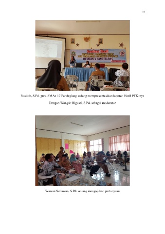 35 Rositoh, S.Pd. guru SMAn 17 Pandeglang sedang mempresentasikan laporan Hasil PTK-nya Dengan Wangsit Rigusti, S.Pd. sebagai moderator Wawan Setiawan, S.Pd. sedang mengajukan pertanyaan