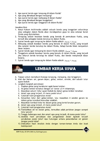 5. Syarat benda agar melayang ke dalam fluida adalah: benda = fluida.