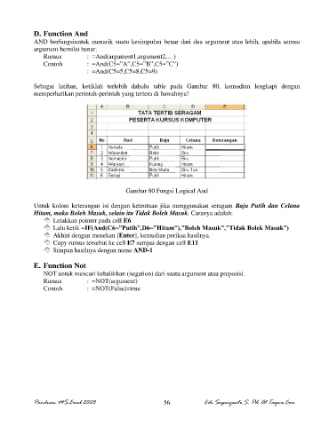Lalu ketik =IF(And(C6=”Putih”,D6=”Hitam”),”Boleh Masuk”,”Tidak Bolek Masuk”)
