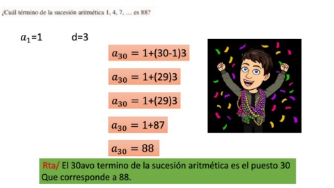 =1 d=3 1 30 = 1+(30-1)3 30 = 1+(29)3 30 = 1+(29)3 30 = 1+87 30 = 88 Rta/ El 30avo termino de la sucesión aritmética es el puesto 30 Que corresponde a 88.