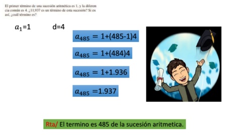 =1 d=4 1 485 = 1+(485-1)4 485 = 1+(484)4 485 = 1+1.936 485 =1.937 Rta/ El termino es 485 de la sucesión aritmetica.