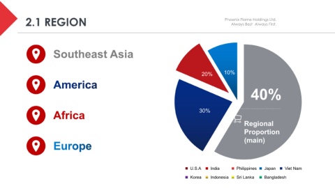 2.1 REGION Phoenix Flame Holdings Ltd. Always Best Always First. Southeast Asia 20% 10% 40% Africa 30% Regional Proportion (main) U.S.A India Philippines Japan Viet Nam Korea Indonesia Sri Lanka Bangladesh