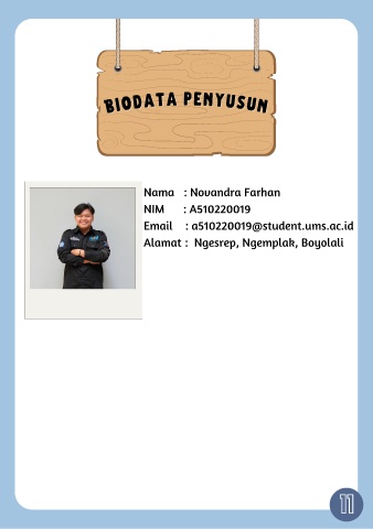 Biodata penyusun Biodata penyusun Nama : Novandra Farhan NIM : A510220019 Email : a510220019@student.ums.ac.id Alamat : Ngesrep, Ngemplak, Boyolali 11