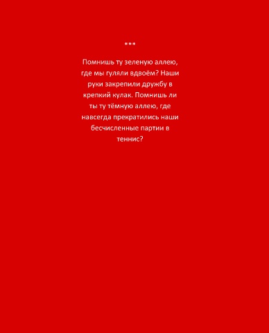 *** Помнишь ту зеленую аллею, где мы гуляли вдвоём? Наши руки закрепили дружбу в крепкий кулак. Помнишь ли ты ту тёмную аллею, где навсегда прекратились наши бесчисленные партии в теннис?